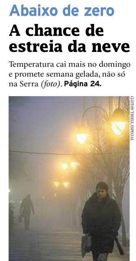 Fonte: primeira página da Zero Hora, 26/6/2011.“Quando cai a primeira neve, no primeiro dia do uso do trenó, é agradável ver a terra branca, os telhados brancos, a respiração é suave, gostosa, e nessa época se recorda os tempos juvenis.”